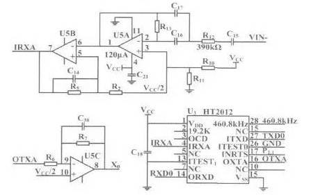 如果检测到FSK FSK频移键控信号,IRXA节点上的1.2千赫信号被解调为“1”,IRXA节点上的2.2千赫信号被解调为“0”,该信号通过串行端口通信RXD0节点传输到C8051F020。C8051F020接收命令帧并进行相应的数据处理;C8051F020生成一个响应帧,然后发送回去。响应帧的数字信号由HT2012调制成相应的1.2千赫和2.2千赫的FSK频移键控信号,即从节点TXD0到节点OTXA的调制过程。在传输信号整形电路进行波形整形后,信号通过AD421叠加在节点X0的环路上进行传输。C8051F020外部连接一个1.8432兆赫兹的晶体振荡器,用作分频4后HART调制和解调的时钟信号源。该电路如图2所示。